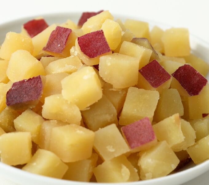 鹿児島県大隅半島などの契約農家産の良質なさつまいもをダイス状にカットして、ボイルシロップ漬けにした使用用途の広い菓材です。パンやケーキのフィリングとして重宝されています。